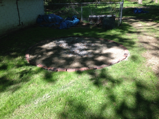 Here are some photos of our first holz hausen. I started by laying out a circle with a 5' radius. I put a stake in the ground at the center, then used a 5' piece of rope to judge the edge. I sprinkled lime on the ground to mark the perimeter. Then I laid bricks around the edge. I covered the ground inside the brick circle with some pea gravel so the wood would not be laying directly on the ground. It has a diameter of 10' and is about 10' high at the peak.